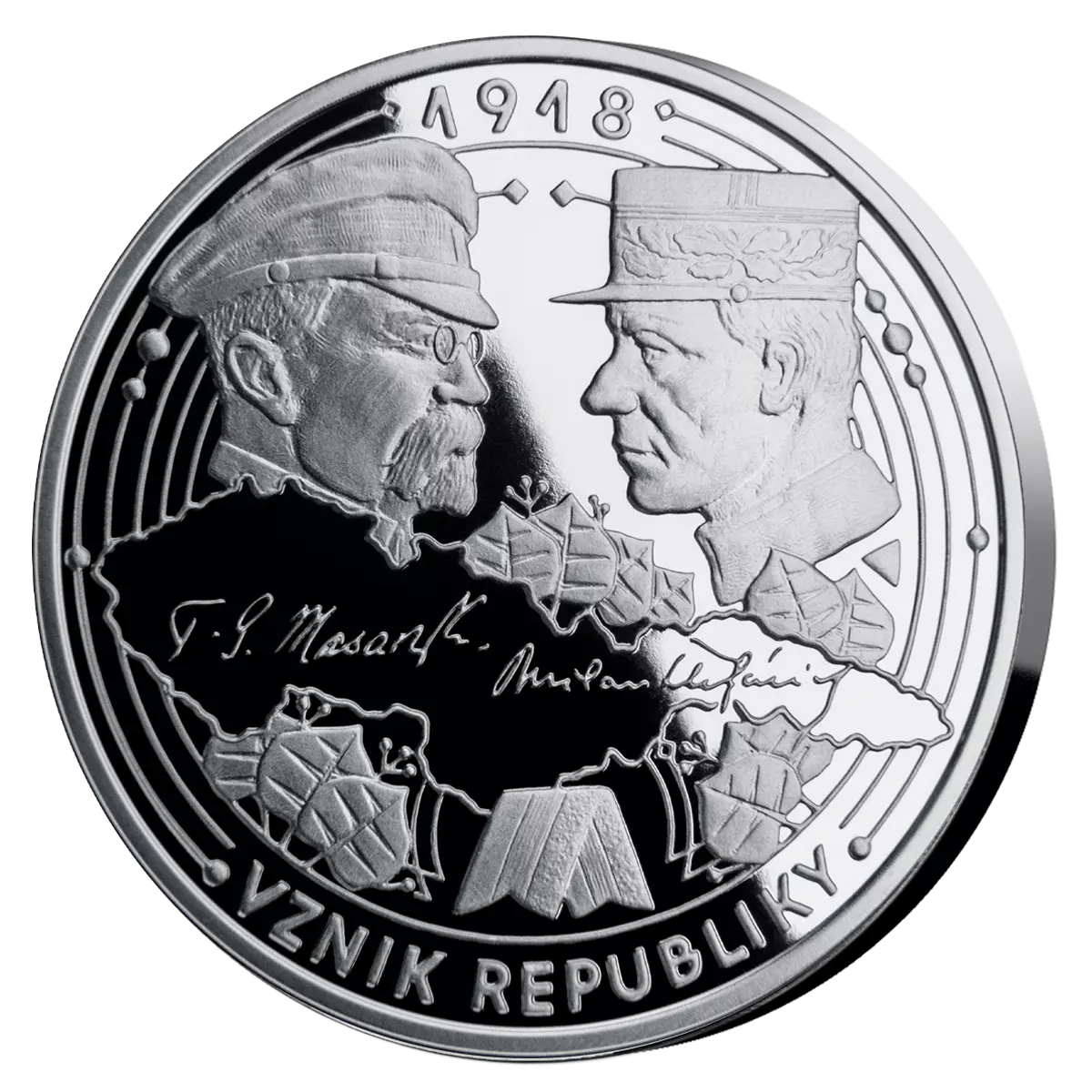 Na prednej strane medaily na seba hľadia dve osobnosti, ktoré sa významne zaslúžili o vznik Československa − prvý prezident Tomáš Garrigue Masaryk a minister vojny Milan Rastislav Štefánik. Ich podpisy kopíruje obrys hraníc prvej republiky. Zadnej strane striebornej pamätnej razby dominuje združený znak légií, ktorý sa v prvých dvoch rokoch existencie Československa používal ako provizórny štátny znak.