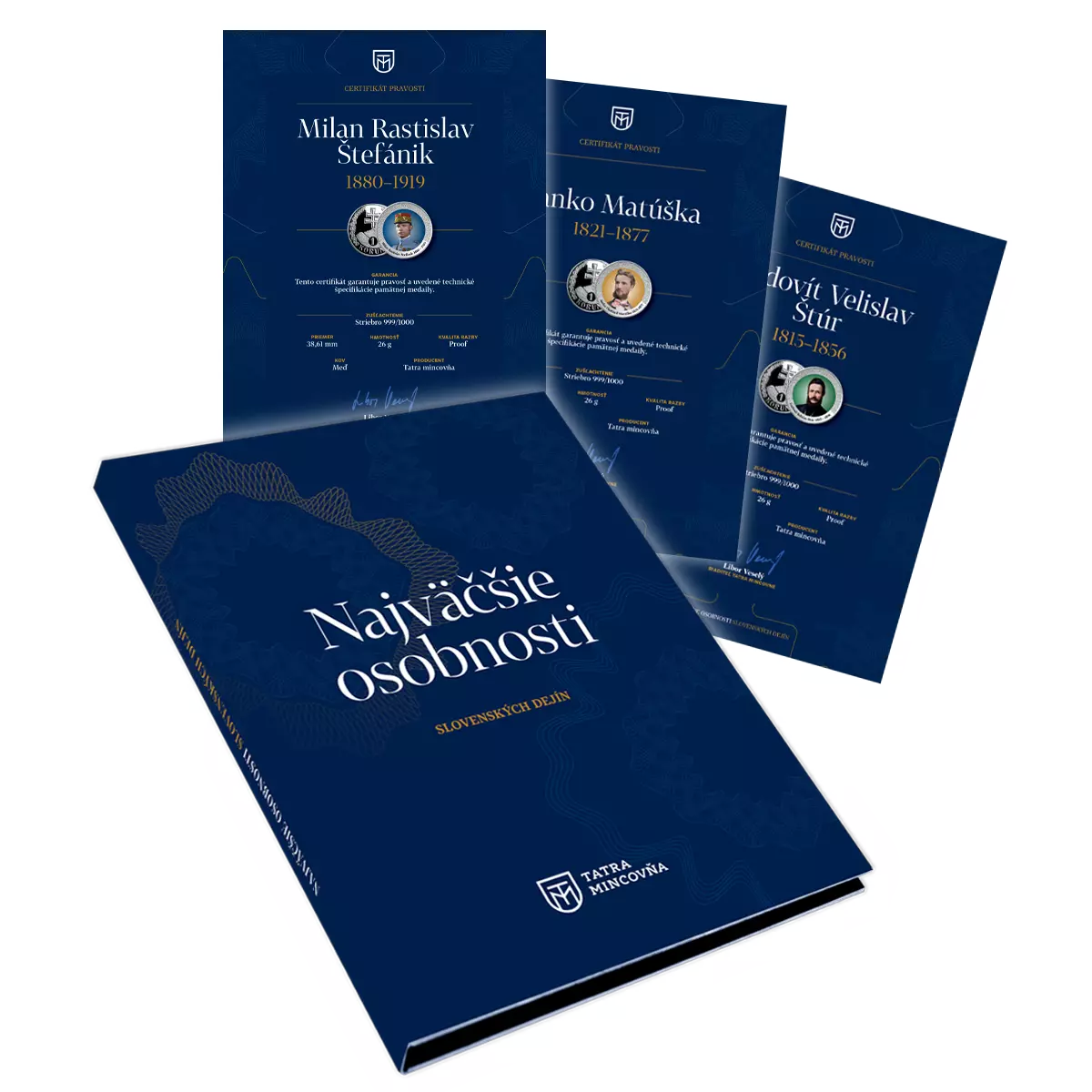Pamätné razby v jedinečnej zbierke Najväčšie osobnosti slovenských dejín pripomínajú dôležité osobnosti histórie nášho národa, na ktoré môžeme byť právom hrdí. Na averze razieb nájdete napríklad originálne stvárnenie osobností, akými boli národný buditeľ Ľudovít Štúr, básnik Andrej Sládkovič, kňaz a vynálezca Jozef Murgaš alebo básnik a dramatik Pavol Országh Hviezdoslav. Rubová strana razieb nesie spoločný motív – originálne umelecké spojenie slovenského dvojkríža, trojvršia a venca z lipového lístia. Symbolická nominálna hodnota 1 KORUNA odkazuje na bohatú tradíciu mincovníctva na Slovensku.
