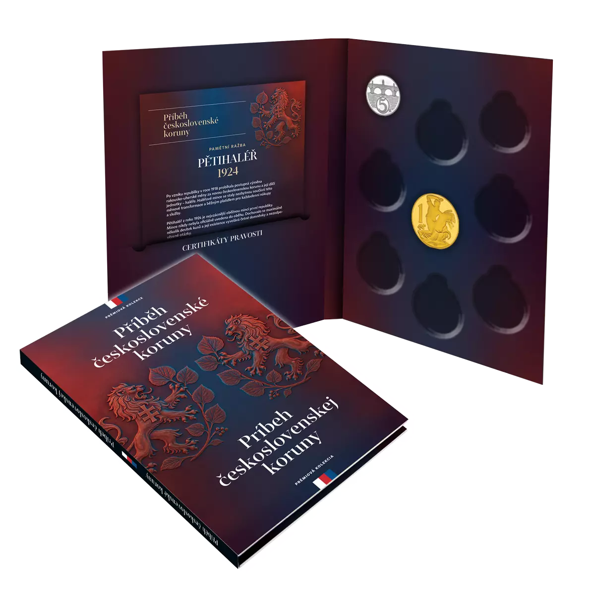 Unikátna kolekcia Príbeh československej koruny rozpráva o osude československej meny od začiatku mladej republiky. Averz pamätnej razby verne zobrazuje originál prvej československej koruny z roku 1922, ktorého autorom je významný medailér Otakar Španiel. Príbeh československej koruny dopĺňajú aj ďalšie pamätné razby významných mincí. Napríklad koruna Františka Jozefa I. z roku 1916, posledná strieborná koruna habsburskej monarchie, ktorá sa razila v období jej rozpadu, alebo najzáhadnejšia obehová minca päťhalier z roku 1924. Dôležitú úlohu zohral aj kolok Československej republiky, jednoduchá kolková známka, prostredníctvom ktorej sa v roku 1919 oddelila stará mena od novej. Do zlomových okamihov patrí aj protektorátna koruna z roku 1941, slovenská minca 1 Ks, či trojhalier z roku 1953, ktorý sprevádzal dramatickú komunistickú menovú reformu. Každá z týchto mincí predstavuje inú etapu vývoja štátu, politiky aj ekonomiky.