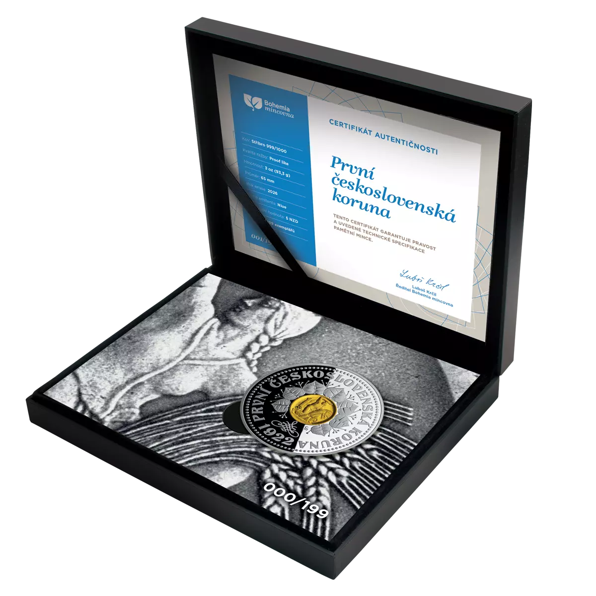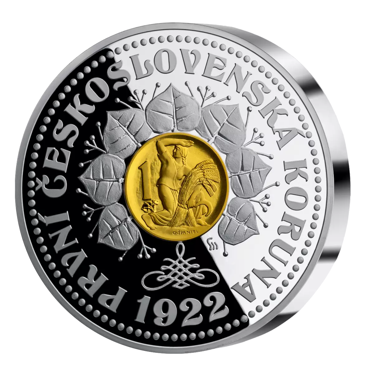 Táto oficiálna minca prenáša prvú československú korunu z roku 1922 do 3 uncí rýdzeho striebra 999/1000 s impozantným priemerom 65 mm.