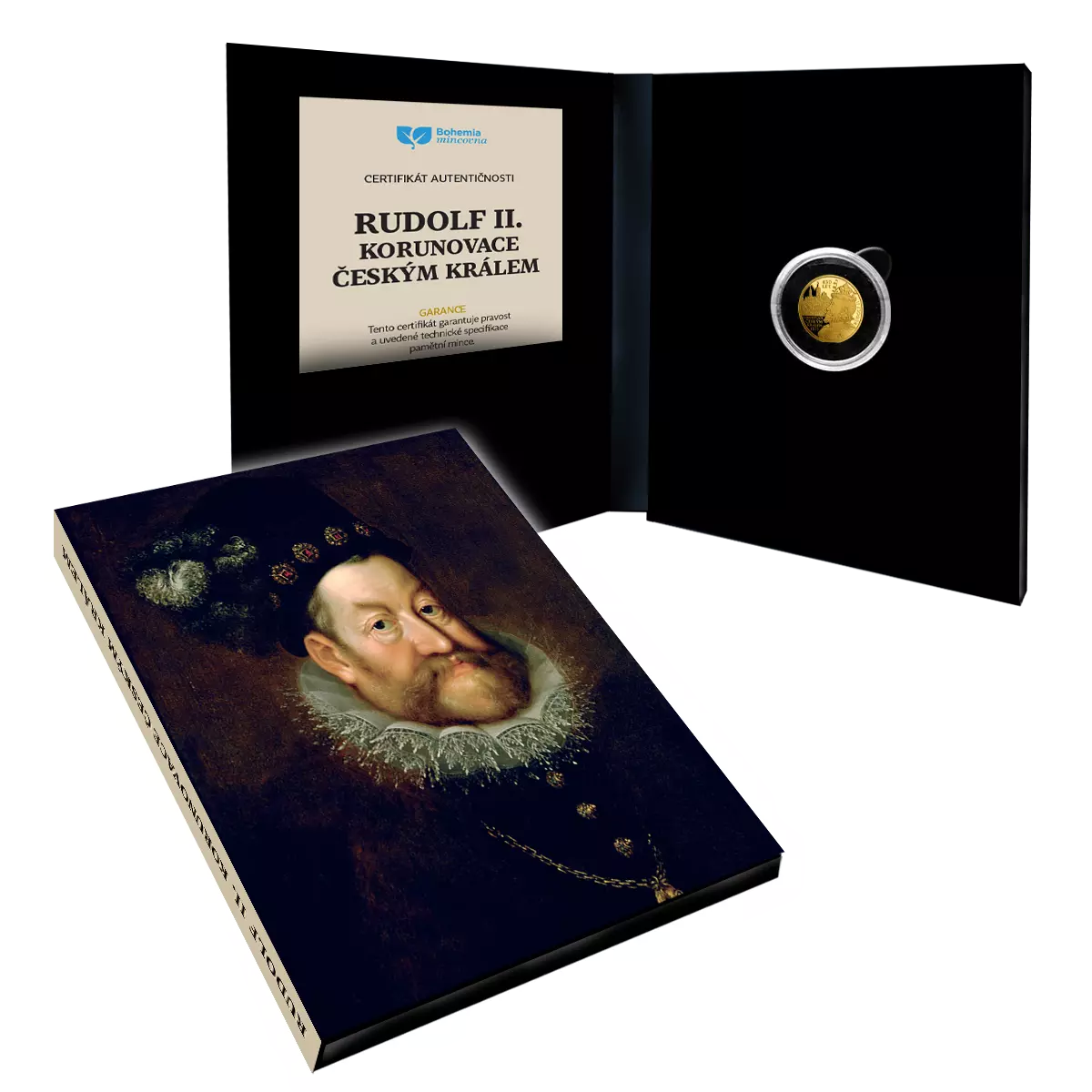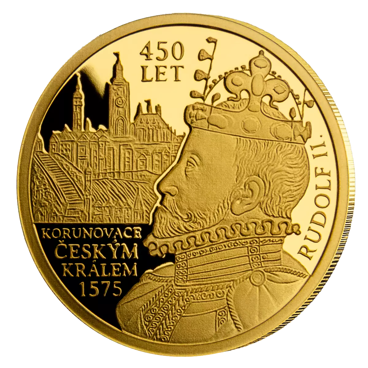 Unikátna pamätná minca oslavujúca 450. výročie korunovácie Rudolfa II. za českého kráľa. Tento prestížny numizmat je vyrazený zo zlata s rýdzosťou 999,9/1000. Minca vychádza v mimoriadne nízkej limitácii iba 300 kusov pre celý svet. Každý exemplár je starostlivo uložený v elegantnom zberateľskom albume a doplnený číslovaným certifikátom autenticity.