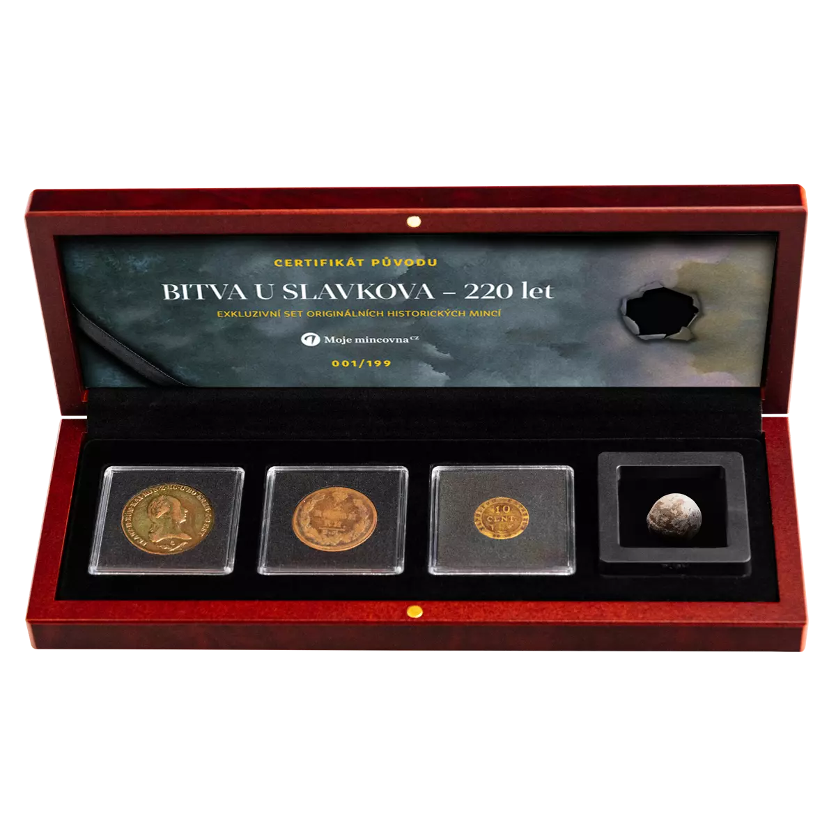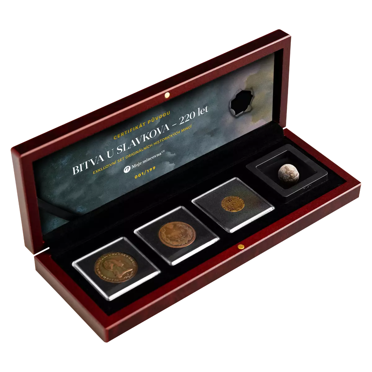 Tento jedinečný set spája tri originálne mince z počiatku 19. storočia s autentickou guľkou vystrelenou z muškety počas napoleonských vojen. Každý z týchto artefaktov nesie stopu doby, keď sa menili hranice, zanikali ríše a rodili sa nové národy.