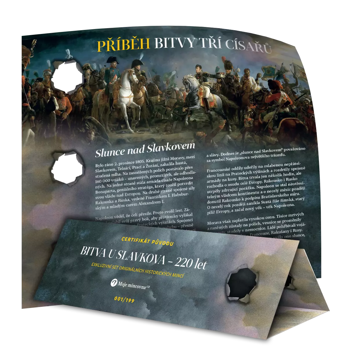 Mince v tomto sete reprezentujú troch panovníkov, ktorých armády sa stretli na moravskom bojisku: Napoleona Bonaparteho, rakúskeho cisára Františka I. a ruského cára Alexandra I. – 10 francúzskych centimov, 6 rakúskych grajciarov a 2 ruské kopejky. Bitka pri Slavkove mala pre české krajiny osobitý význam, hoci sa ich priamo politicky netýkala. Odohrala sa totiž na moravskom území neďaleko Brna a miestnym obyvateľom priniesla obrovské utrpenie. Polia boli spustošené, dediny plné ranených a mŕtvych a mnohé domy museli poslúžiť ako lazarety. Spomienka na túto udalosť však zostala hlboko zakorenená – Morava sa stala dejiskom jedného z najväčších vojenských stretov európskych dejín. Aj preto je Slavkov dodnes miestom, kam sa ľudia vracajú nielen kvôli pamätníkom a historickým rekonštrukciám, ale aj kvôli pripomienke, že „veľké dejiny“ sa často odohrávajú aj v krajinách, ktoré by si samy o sebe nikdy takúto pozornosť neželali.