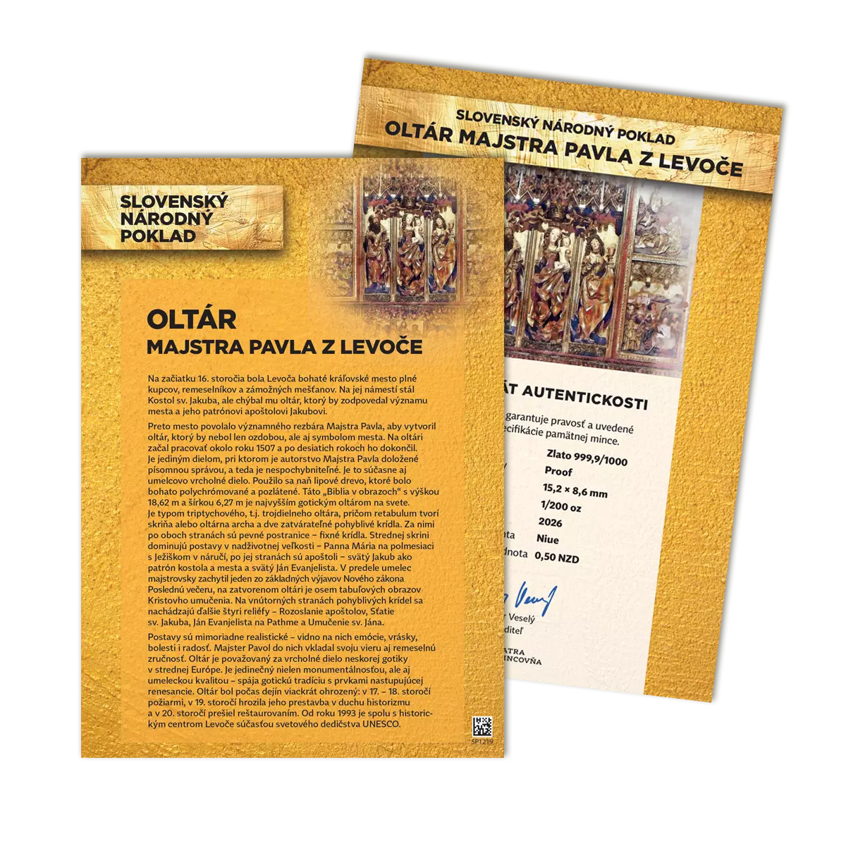 Pamätné tehličky z rýdzeho zlata v úplne novej zbierke s názvom Slovenský národný poklad Vás prevedú najvýznamnejšími historickými artefaktmi Slovenska. Táto špeciálna kolekcia s názvom Slovenský národný poklad je prvou zbierkou svojho druhu. Jednotlivé zlaté tehličky Vám na svojich averzoch postupne predstavia naše najcennejšie dedičstvo, medzi ktoré nepochybne patria Oltár Majstra Pavla z Levoče, Keltská mincovňa v Bratislave, Nitriansky kódex, plakety z Bojnej, kríž z Veľkej Mače a ďalšie.