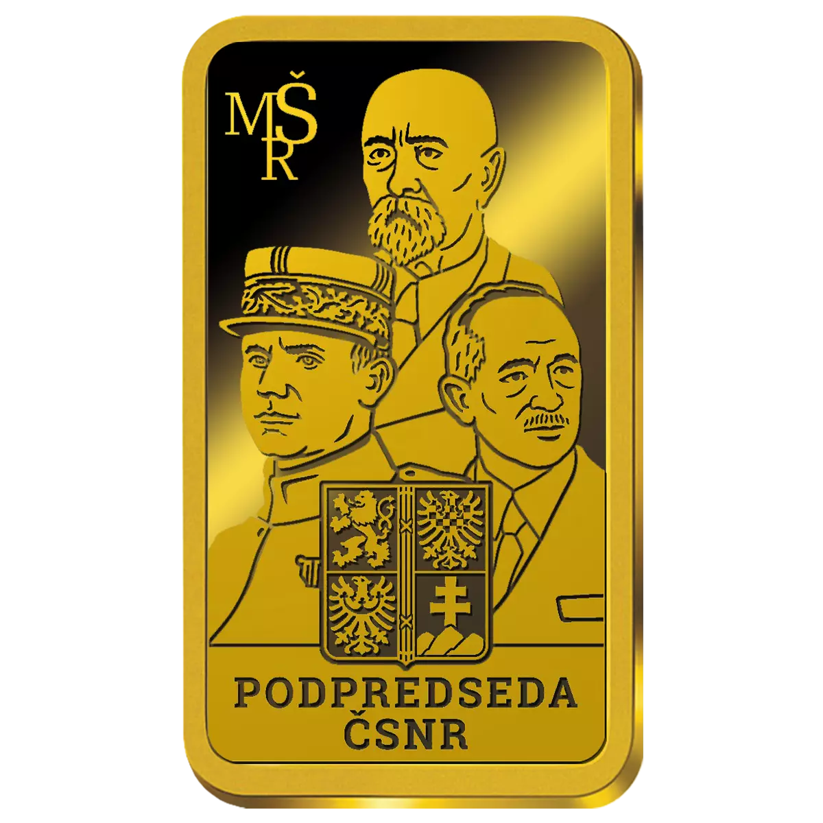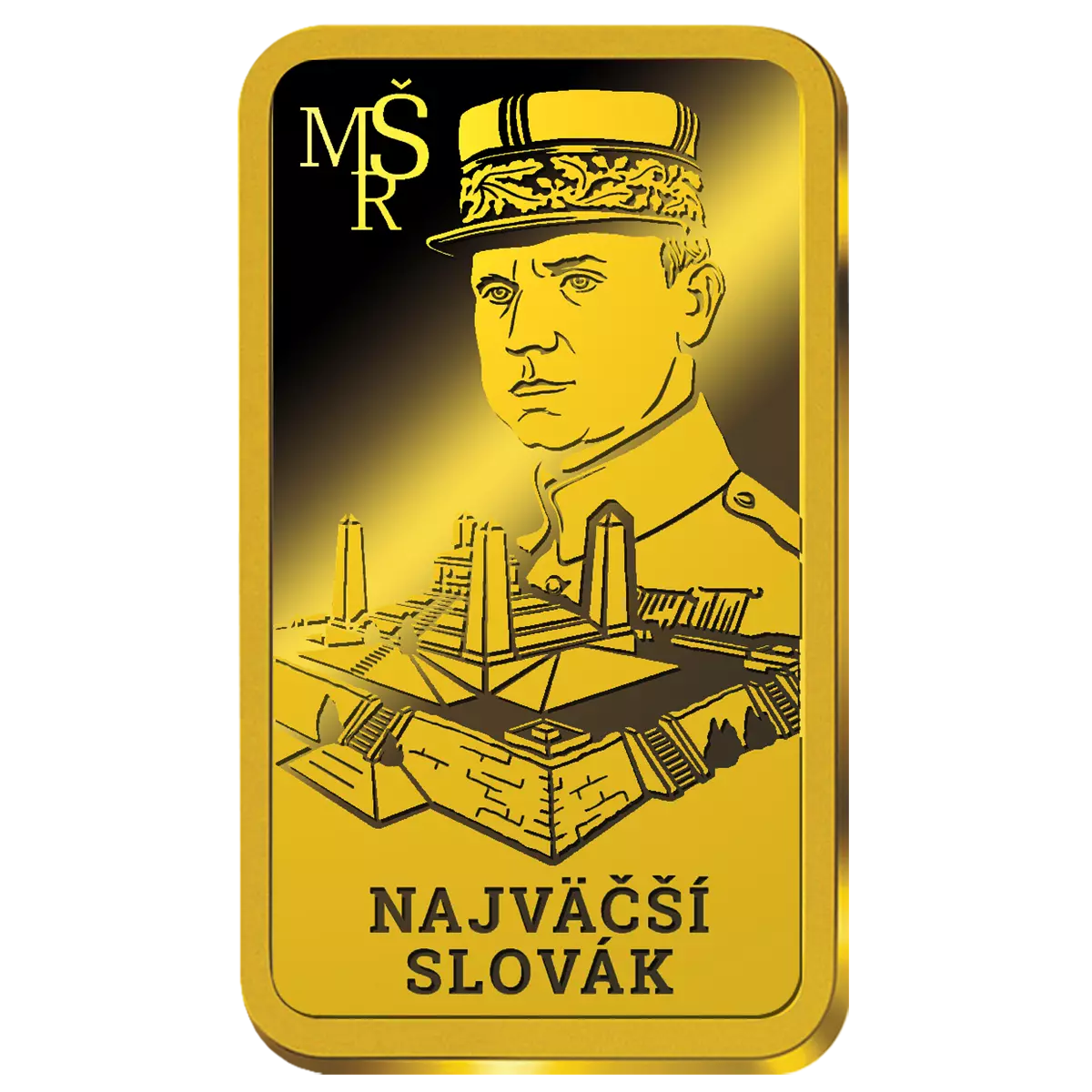 Pamätná tehlička razená do 1/200 unce rýdzeho zlata 999,9/100 v najvyššej kvalite razby na svojom averze zobrazuje najväčšieho Slováka Milana Rastislava Štefánika. Bol jednou z najvýraznejších osobností moderných československých dejín a jeho činy mali zásadný vplyv na budovanie slovenskej identity a moderného štátu. Bol vedec, astronóm, vojak, diplomat, politik a jeden z kľúčových spoluzakladateľov Československa. Jeho životný príbeh je fascinujúcim spojením vedy, diplomacie, odvahy a odhodlania bojovať za slobodu svojej krajiny. Milan Rastislav Štefánik bol človek s neobyčajnou energiou, schopnosťami a odvahou, ktorého životný príbeh dodnes inšpiruje nielen na Slovensku, ale aj na celom svete.