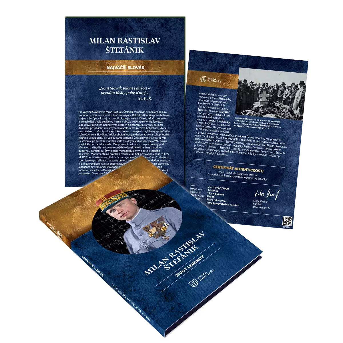 Pamätná tehlička Milan Rastislav Štefánik – Najväčší Slovák, ktorá je razená v najvyššej numizmatickej kvalite Proof v rýdzom zlate 999,9/1000, sa dodáva spolu s certifikátom pravosti zaručujúcim pravosť, pôvod a technické špecifikácie tejto numizmy. Táto výnimočná razba uvádza exkluzívnu kolekciu Milan Rastislav Štefánik – Život legendy.